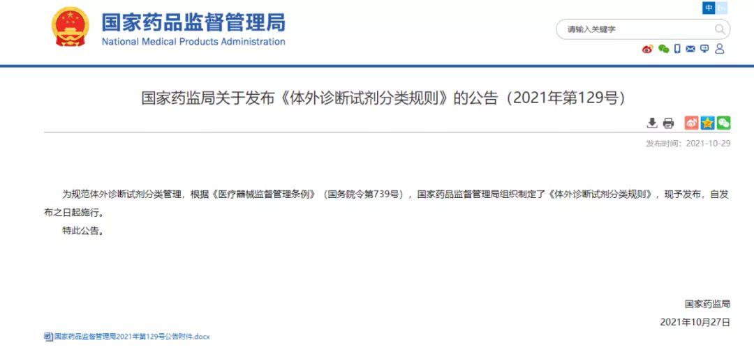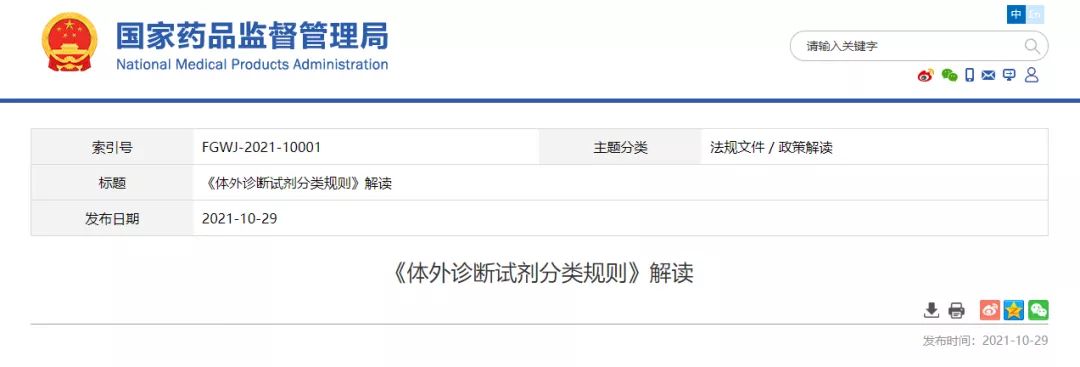 第八條 體外診斷試劑分類目錄由國家藥品監(jiān)督管理局制定并發(fā)布。國家藥品監(jiān)督管理局根據(jù)體外診斷試劑生產(chǎn)、經(jīng)營、使用情況,及時對體外診斷試劑的風險變化進行分析、評價,對體外診斷試劑分類目錄進行調整。