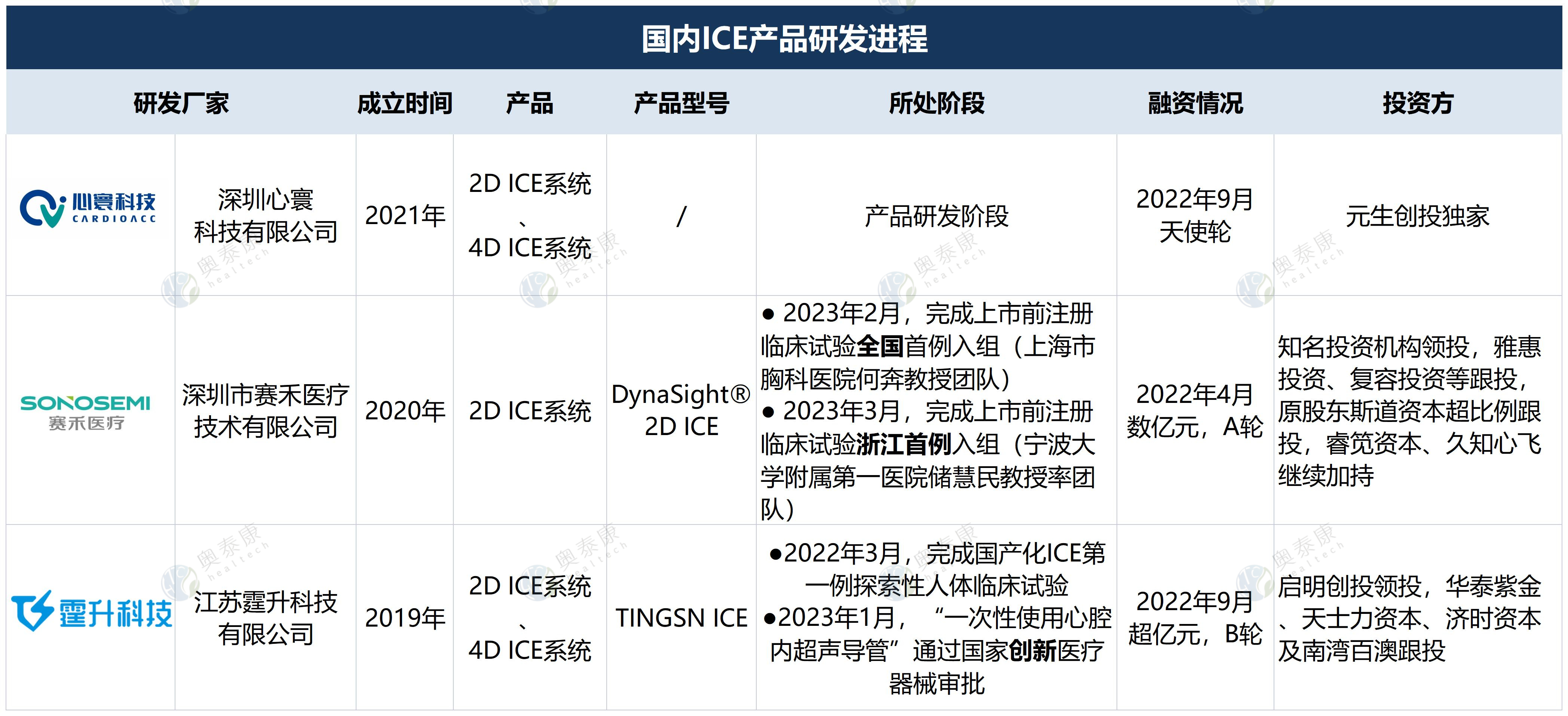 全球ICE市場中,歐美企業(yè)占主要份額,強生、雅培、西門子、飛利浦、GE醫(yī)療、波士頓科學等均已布局,而國內(nèi)ICE起步較晚,仍處發(fā)展初期,相關產(chǎn)品和市場滲透率較低,企業(yè)具有較大的發(fā)展空間,國內(nèi)研發(fā)廠商有塞禾醫(yī)療、心寰科技、霆升科技、澤樸醫(yī)療、歡影醫(yī)療等。隨著ICE在臨床應用優(yōu)勢的凸顯,ICE賽道逐漸升溫并獲得資本青睞,國內(nèi)部分ICE廠家已在2022年完成新一輪融資。