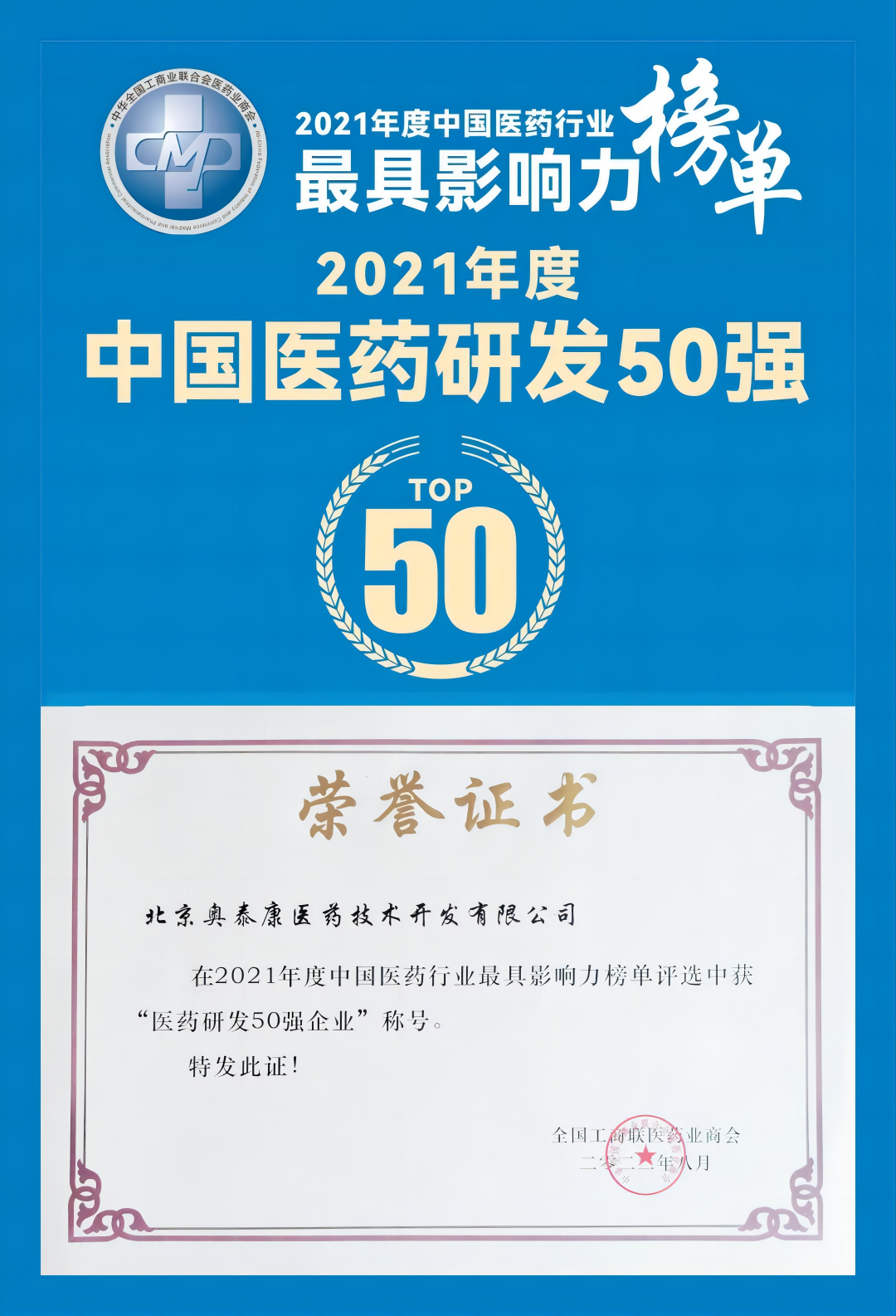 2023年3月25日-27日,全國工商聯(lián)醫(yī)藥業(yè)商會(huì)年度峰會(huì)于青島隆重舉行,大會(huì)公布了“2021年度中國醫(yī)藥行業(yè)最具影響力榜單”,奧泰康在本次評(píng)選中入圍中國醫(yī)藥研發(fā)50強(qiáng)榜單。