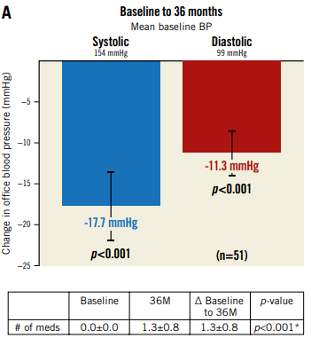△ 試驗(yàn)結(jié)果:36個(gè)月的隨訪資料顯示,當(dāng)兩組使用了治療強(qiáng)度相似的抗高血壓藥物時(shí),RDN組動(dòng)態(tài)收縮壓降幅顯著高于假手術(shù)組,RDN治療與Sham相對(duì)比,顯著降低患者血壓可達(dá)3年,且無(wú)安全性問(wèn)題,這一療法可作為高血壓患者藥物治療的替代方案。