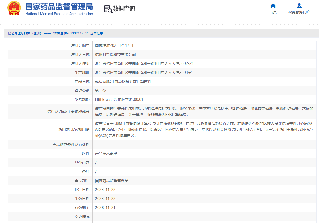 近日,國家藥監(jiān)局網(wǎng)站公開發(fā)布了最新一批三類醫(yī)療器械批準清單,杭州阿特瑞科技有限公司研發(fā)的《冠狀動脈CT血流儲備分數(shù)計算軟件》(簡稱FFRCT)已經(jīng)獲批上市(圖1),該軟件核心算法完全自主研發(fā),不受制于人。該產(chǎn)品由中美團隊聯(lián)合研發(fā),雙院士團隊臨床驗證,是目前國內(nèi)唯一采用全三維流體力學(xué)方程+超級計算機計算且被商業(yè)保險公司認可的產(chǎn)品,也是目前被國家藥監(jiān)局認可不需要在“灰區(qū)”(介于0.75至0.85)和冠脈彌漫性病變進一步研究的無創(chuàng)醫(yī)療產(chǎn)品。