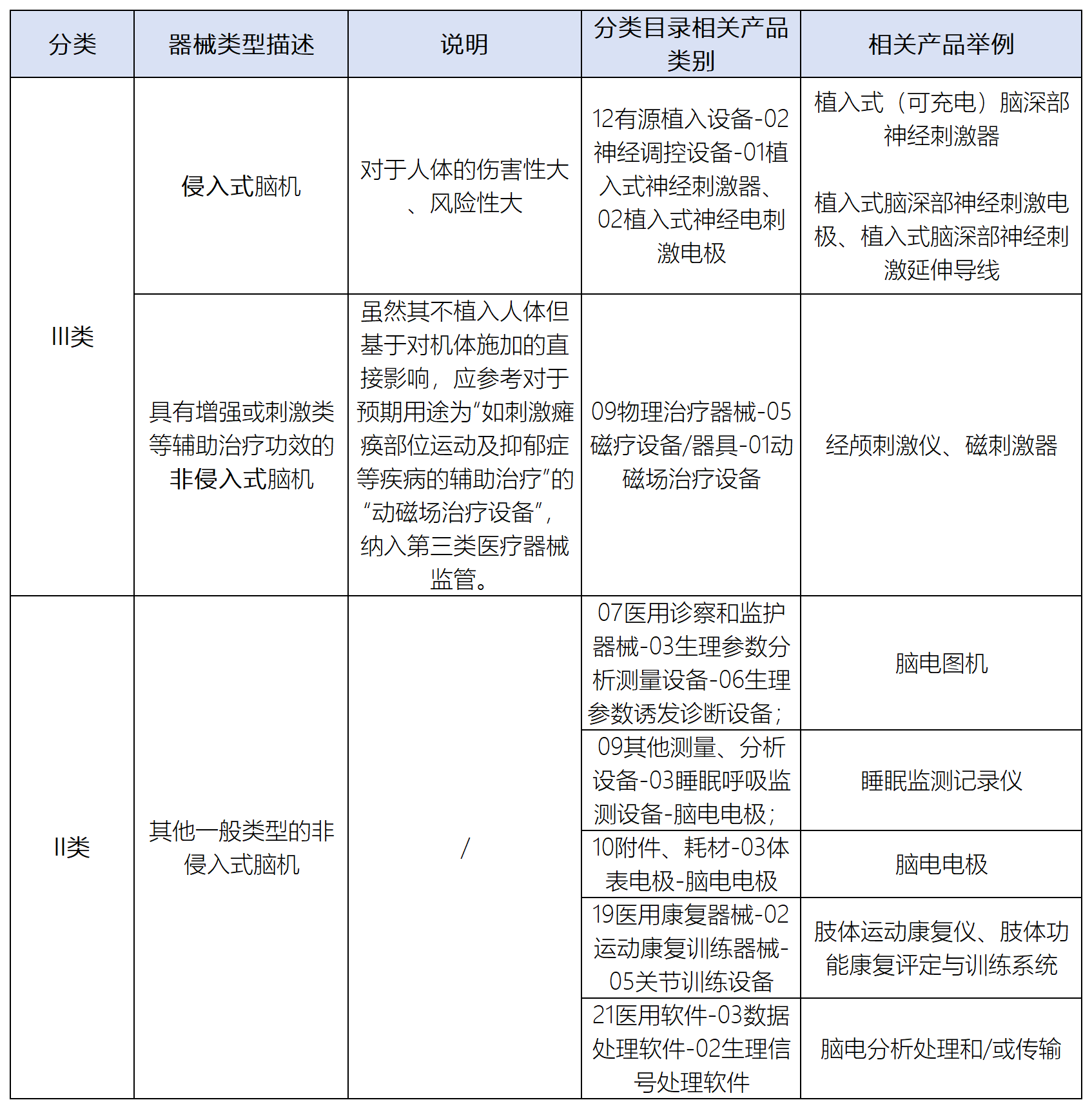 中國(guó)器審發(fā)布的《腦機(jī)接口的監(jiān)管現(xiàn)狀》指出,由于III類醫(yī)療器械在注冊(cè)難度、監(jiān)管要求、申請(qǐng)受理部門層級(jí)和申請(qǐng)時(shí)長(zhǎng)等方面都遠(yuǎn)高于II類醫(yī)療器械,我國(guó)腦機(jī)企業(yè)目前大多選擇非侵入式采集技術(shù)路線。對(duì)于侵入式腦機(jī)設(shè)備,目前都處在臨床性研究和動(dòng)物實(shí)驗(yàn)階段。目前暫無(wú)公開(kāi)性的由國(guó)家藥品監(jiān)督管理局正式批準(zhǔn)進(jìn)入人體臨床試驗(yàn)階段的侵入式腦機(jī)器械。根據(jù)廣義BCI的定義,結(jié)合我國(guó)現(xiàn)行《醫(yī)療器械分類目錄》的規(guī)定,與BCI相關(guān)設(shè)備的分類主要為II類和III類: