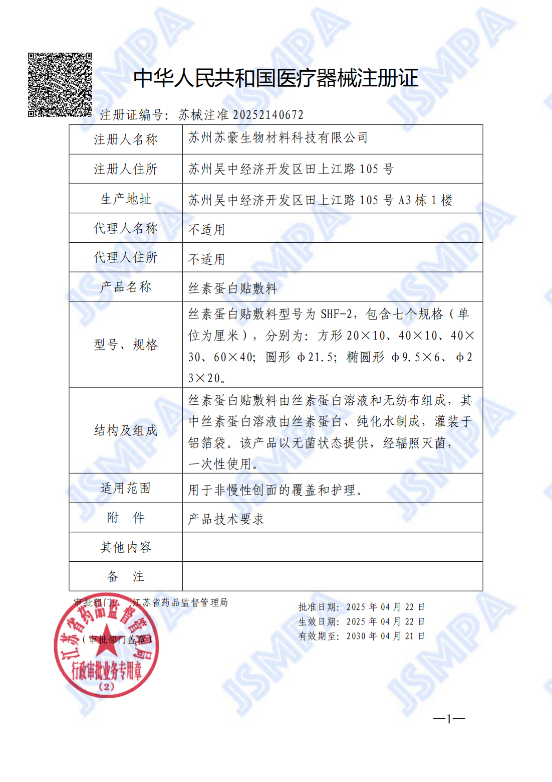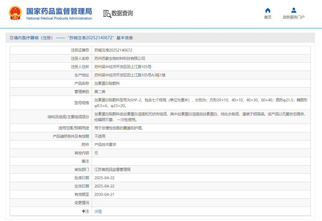 喜訊?????????奧泰康蘇州CDMO中心研發(fā)的「絲素蛋白貼敷料」獲國(guó)家藥監(jiān)局批準(zhǔn)上市2025年4月22日,經(jīng)國(guó)家藥品監(jiān)督管理局公示,奧泰康蘇州CDMO中心研發(fā)的絲素蛋白貼敷料(蘇械注準(zhǔn)20252140672)獲得NMPA批準(zhǔn)上市,產(chǎn)品獲批國(guó)家第二類(lèi)醫(yī)療器械注冊(cè)證。