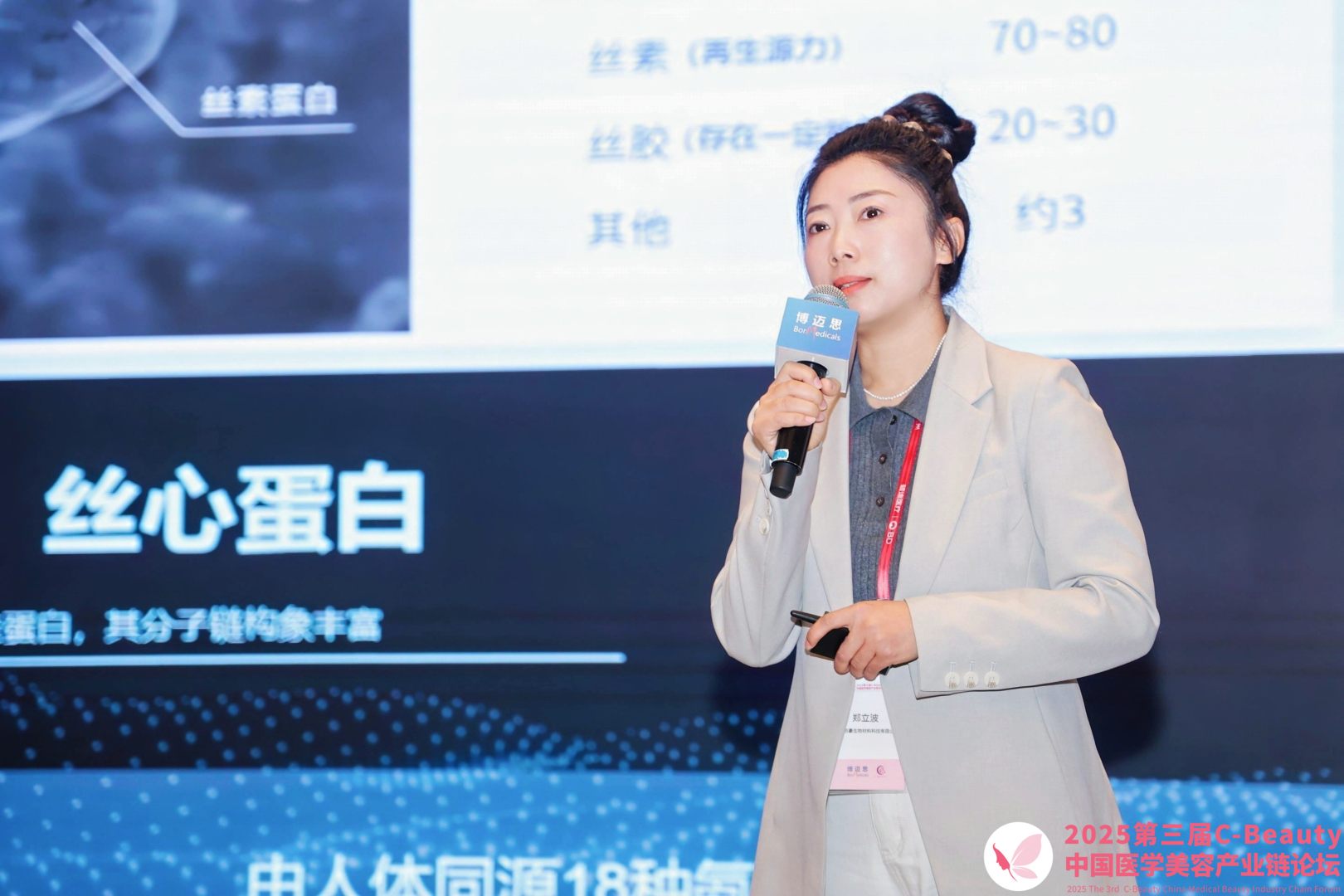 鄭立波女士圍繞絲素蛋白的天然優(yōu)勢(shì)、技術(shù)突破與美妝市場(chǎng)前景進(jìn)行了深度分享。